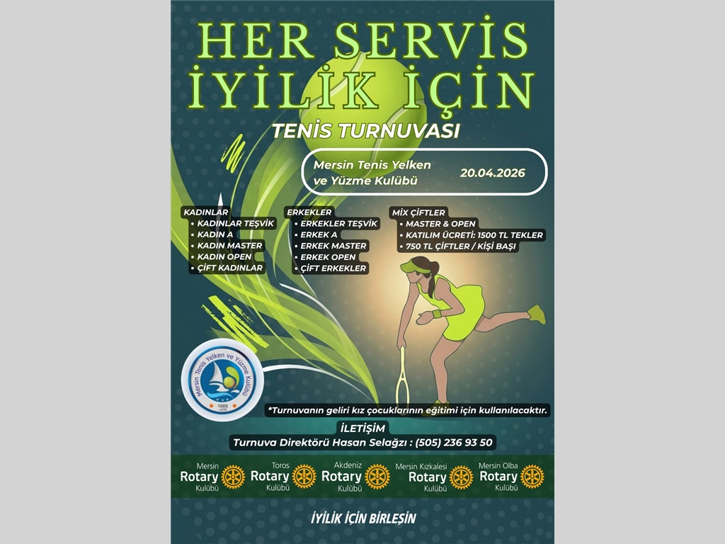 ''HER SERVİS İYİLİK İÇİN" SLOGANIYLA TENİS TURNUVAMIZ BAŞLIYOR. TURNUVAMIZ KIZ ÇOCUKLARINA DESTEK OLMAK AMACIYLA YAPILMAKTADIR. KULÜBÜMÜZ TESİSLERİNDE ELEME USULÜ YAPILACAK TURNUVAMIZA KATILIMINIZI BEKLER, BAŞARILAR DİLERİZ. YÖN.KRL. SON KATILIM TARİHİ 20 NİSAN 2026 DIR.